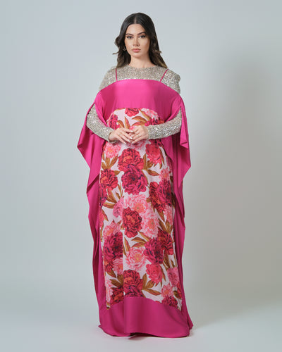 Qabeela presents this extremely stylish kaftan set. With bold floral prints on trend, we think this stylish elegant cut kaftan, fully lined in silk satin & chiffon print , over a stretch silver sequins body suit is sure to make a style statement. light weight, breezy yet ever so eye catching this kaftan will certainly up the style stakes.