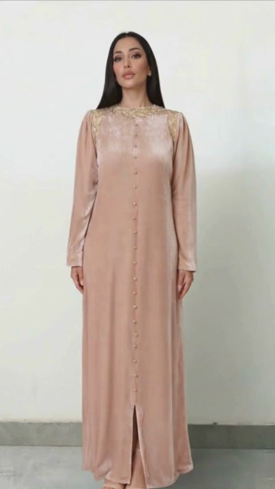 Discover timeless elegance with this blush velvet dress. Crafted from luxurious silk velvet, this dress features a sleek straight silhouette offering comfort and elegance. The gold lace embellished adds a touch of glamour, while the front button detailing creates classic, elongated look. It has a front slit for ease of movement. This piece is perfect for formal occasions and evening events.