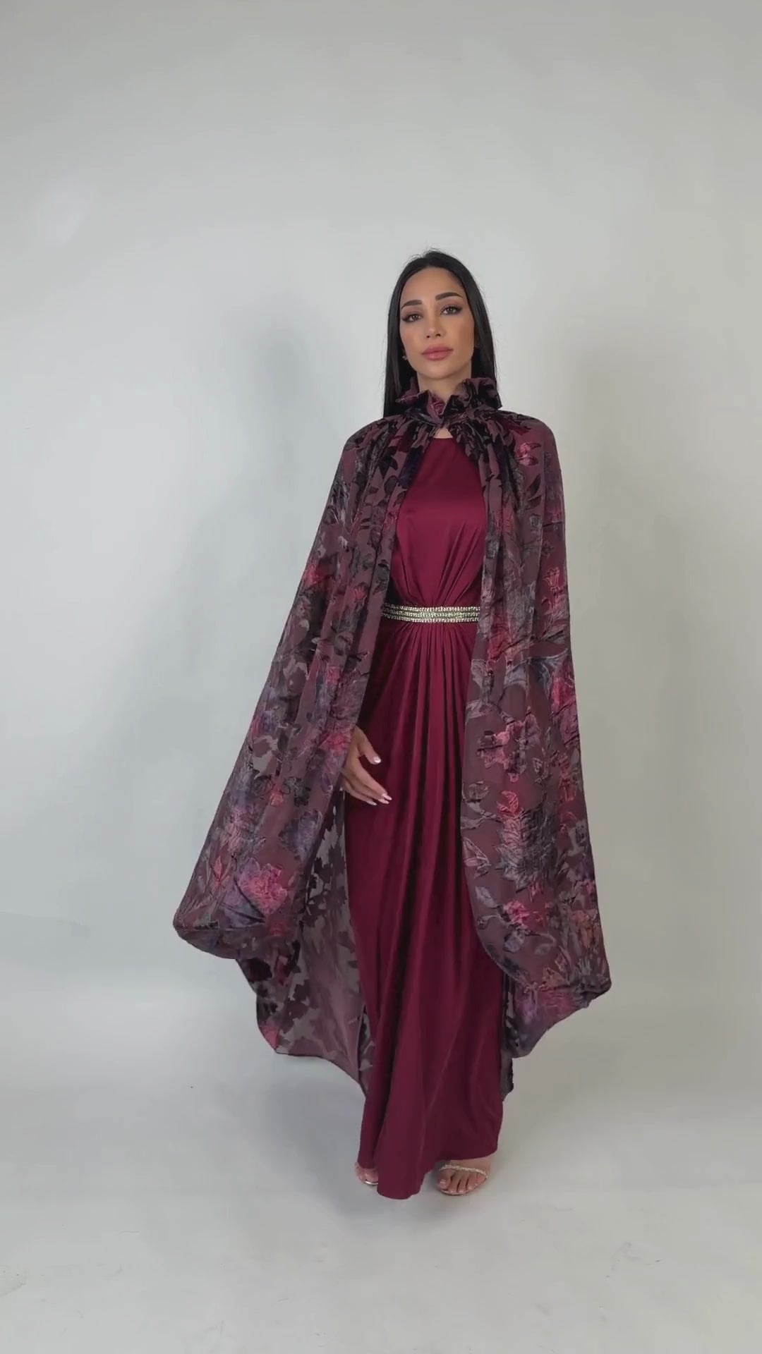 This is an elegant two piece set dress featuring a floral flowing cape overlay. The dress comes in a rich burgundy tone with matching sheer floral cape. Dress is designed with longsleeves with a flattering gathered waist and emellished crystal detail, creating a feminine silhoutte. The lightweight cape falls elegantly over the shoulders to down, offering coverage while maitaining a sophisticated look.