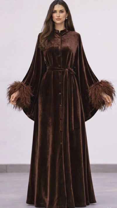 Make a statemet with this luxurious velvet kaftan. Made from rich brown tone silk velvet. The front button-down detail adds a classic touch, while the feather and crystal lace on the cuff brings glamorous, fashion-forward look. Perfect for evening wear, pair it with heels and jewelry for a chic, refined look. Matching Shela sold separately.