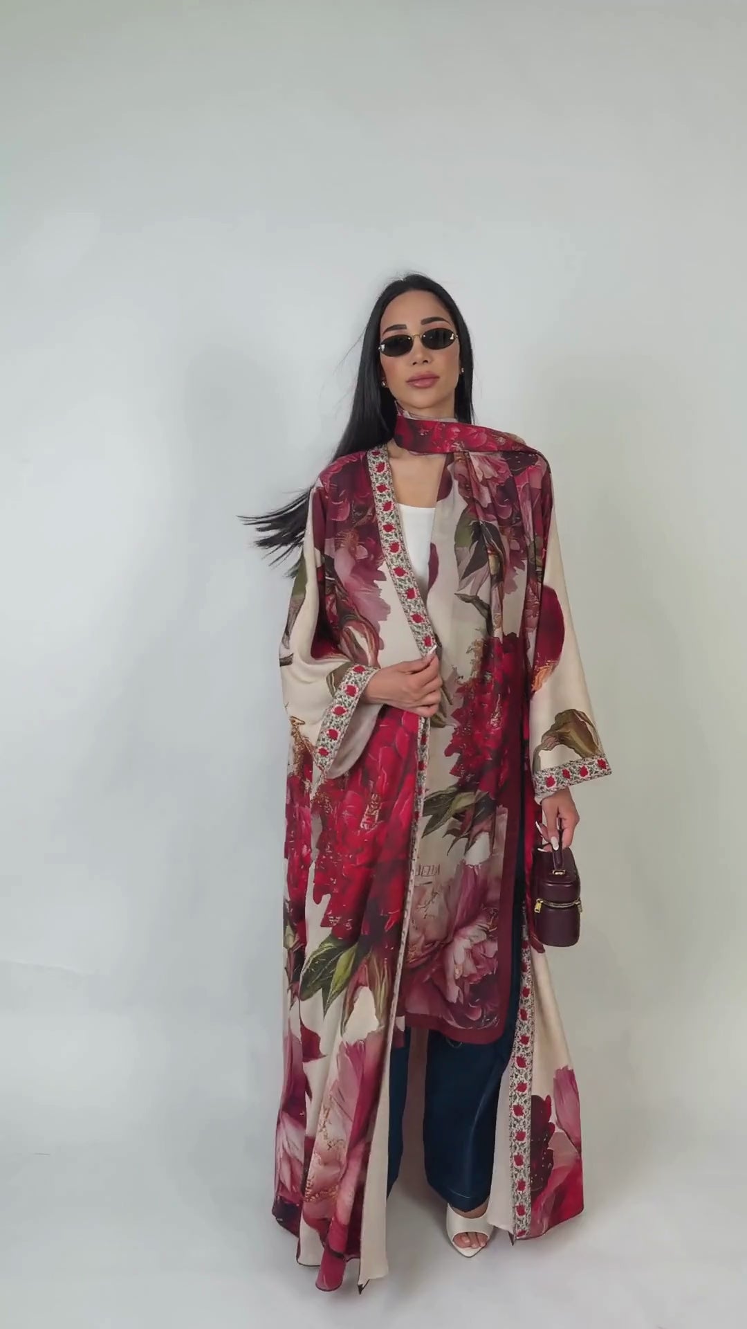 Elevate your wardrobe with this floral printed crepe abaya, designed for effortless elegance and everyday sophistication. Crafted from lightweight, flowy fabric, this abaya features a stunning all-over floral print in rich shades of pink, red, and neutrals, creating a feminine and timeless look.The front and sleeves bottom has detailed patterned boarder that adds a refined touch. Paired with a perfectly coordinated matching sheila, this set offers a complete outfit suitable for casual wear, gatherings, or special occasions.