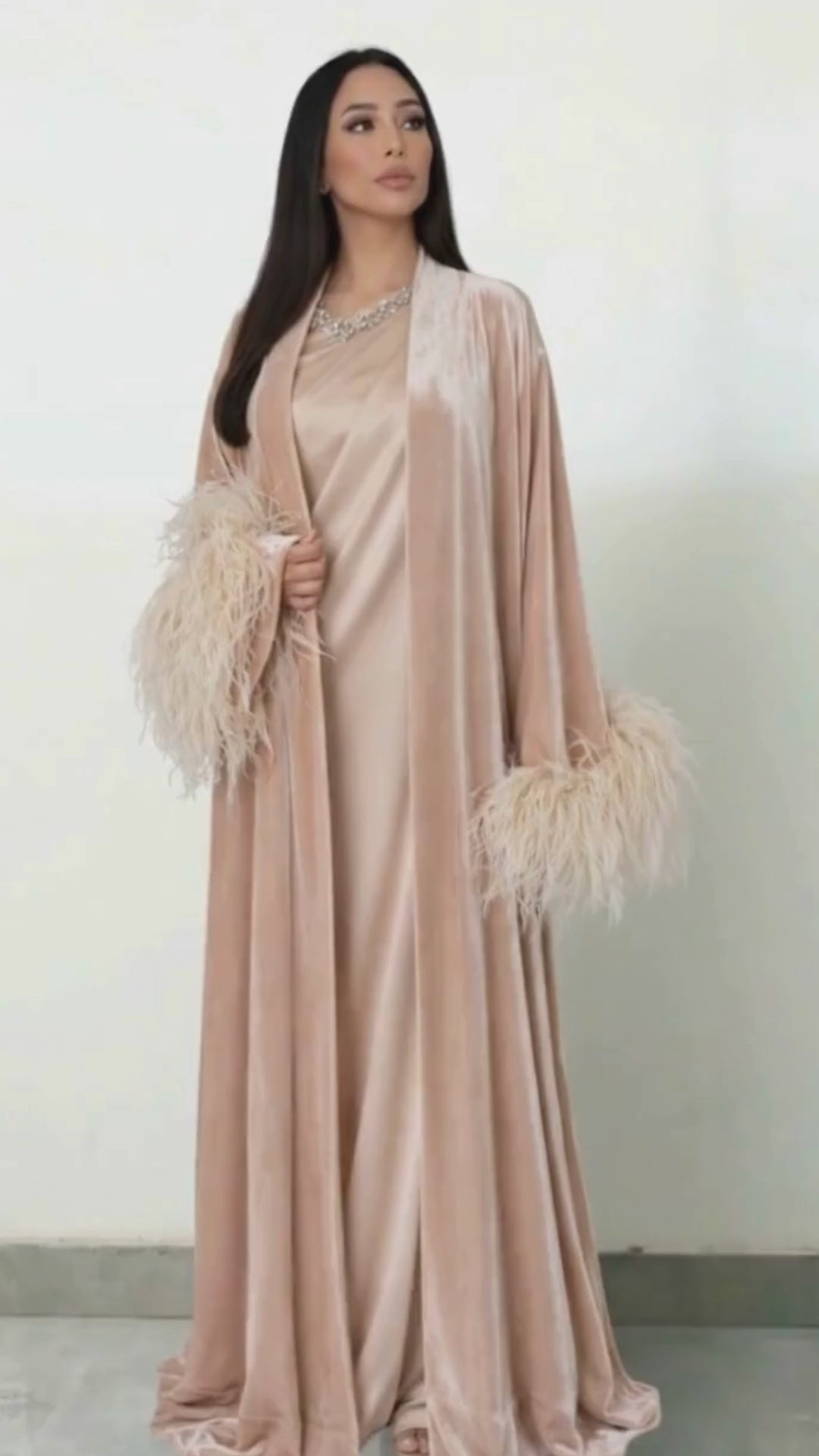 Indulge in understated luxury with this beautifully crafted abaya and dress set. The abaya is made from  blush silk velvet. The statement feather on the cuffs add a glamorous touch, making this piece perfect for special occasions. Paired with a one shoulder drape silk inner dress in a matching nude tone with a crystal lace on the neck. Ideal for Ramadan, EID and special occasions.